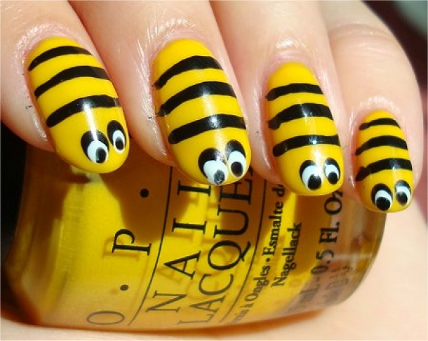 4. Rupe o scobitoare în două, iar cu partea groasă fă două puncte albe. Lasă-le să se usuce apoi umple-le cu două puncte albe pentru ca, la final, să foloseşti vârful scobitorii pentru a face încă un rând de puncte negre. Aceştia sunt ochii albinelor.