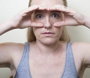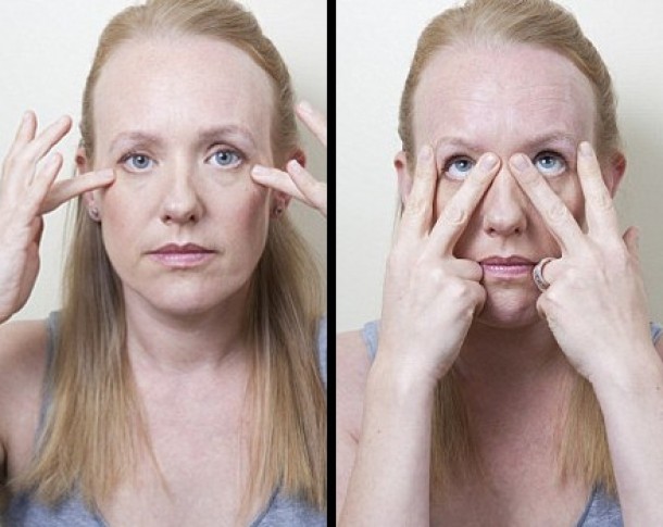 Bufnita (foto 1): Tine degetele in dreptul ochilor, in forma literei C, dupa care relaxeaza-ti fruntea si deschide ochii larg cu ajutorul degetelor. Repeta de trei ori si mentine pozitia timp de 10 secunde, ca in imaginea din galerie.