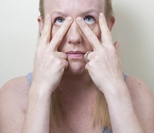 Victorie (foto 2): Plaseaza degetul aratator si mijlociu de la ambele maini in dreptul colturilor ochiurilor si intinde. Relaxeaza si repeta de sase ori. Incheie prin inchiderea stransa a ochilor timp de 10 secunde. Relaxeaza.