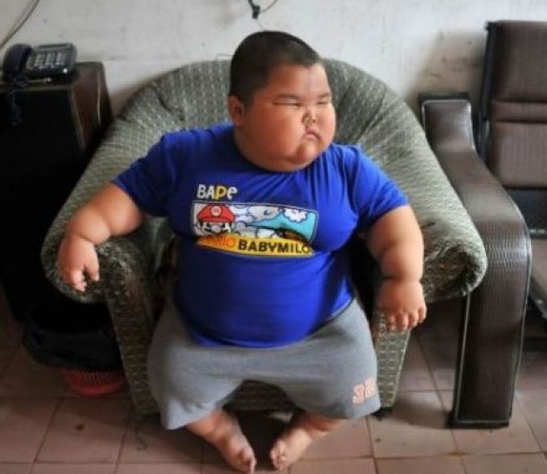 Baietelul cantareste de cinci ori mai mult decat greutatea normala. Lu mananca trei portii de orez la masa de seara.