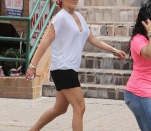 A inlocuit pantofii cu toc cu o pereche de flip-flops si outfitul ales era compus dintr-o pereche de pantaloni scurti negri si un top alb din bumbac. Expunerea indelungata la soare poate fi foarte periculoasa si Jennifer este cat se poate de constienta de acest lucru. Asa ca si-a protejat capul, asa cum specialistii ne sfatuiesc sa facem in timpul verii, cu o esarfa cu imprimeu floral.