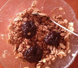 Reteta este simpla si consta in: fulgi de orz, 2 lingurite de magiun de prune (fara zahar, coloranti, aditivi) plus 2-3 prune deshidratate (puteti sa renuntati la ele).