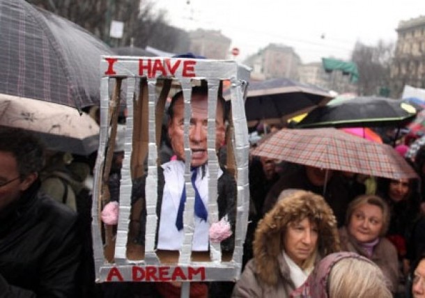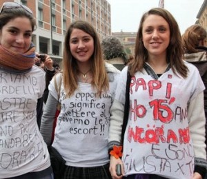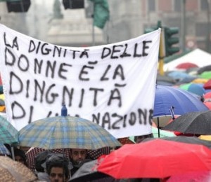 "Deminitatea femeilor este deminitatea unei natiuni", "Berlusconi pleaca", Deminitate pentru femei" sunt doar cateva dintre sloganurile afisate in timpul protestului.