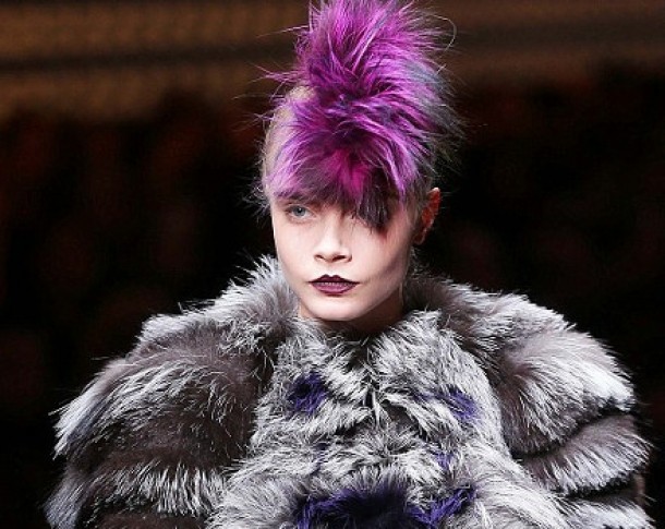 Modelul si-a aranjat parul in ton cu jacheta din blana gri cu elemente indigo si geanta inedita, optand pentru o coafura stil mohawk, in nuante de mov aprins.