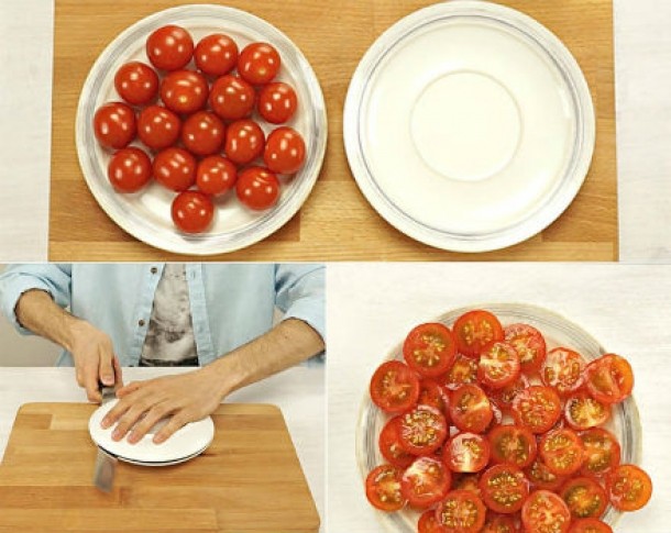 Ai nevoie de 10 rosii cherry, doua farfurii si un cutit cu o lama mare si foarte bine ascutita. Pune rosiile pe o farfurie, asezandu-le una langa cealalta. Pune apoi cealalta farfurie deasupra, pe post de capac.