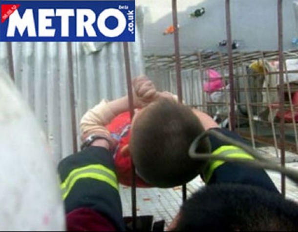 Trecatorii au vazut cum la etajul superior al unei cladiri din China se balanseaza un copil printre gratiile balconului. Inspaimantati au chemat imediat echipajele de salvare care au reusit sa il scoata la timp pe baiatul cu urechi mari dintre fiarele care l-au tinut in viata, se arata pe metro.co.uk.