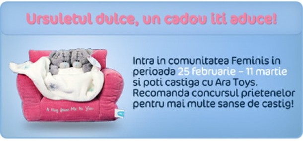 Tot ce trebuie sa faci este sa accesezi http://www.feminis.ro/forum/sarcina-si-copii/copilul-meu/ursuletul-dulce-un-cadou-iti-aduce-16092/#last si sa ne povestesti despre jucariile tale din plus.