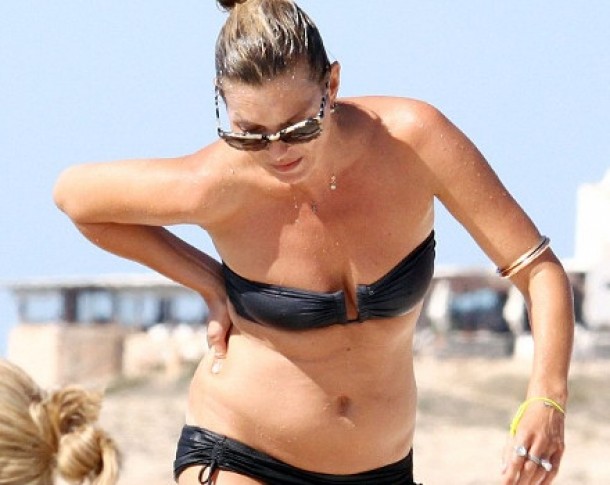 Vedeta s-a afisat fara probleme intr-un costum de baie negu, din doua piese, care ii lasa la vedere silueta nu tocmai perfecta.