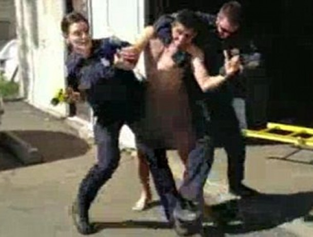 Doi politisti au sosit la fata locului cu intentia de a-l aresta pe individ, insa acesta a devenit agresiv. Desi trecatorii au incercat sa le dea o mana de ajutor politistilor, nu reuseau sa il imobilizeze pe exhibitionist. "Erau in jur de cinci persoane care incercau sa-l potoleasca si nu reuseau."