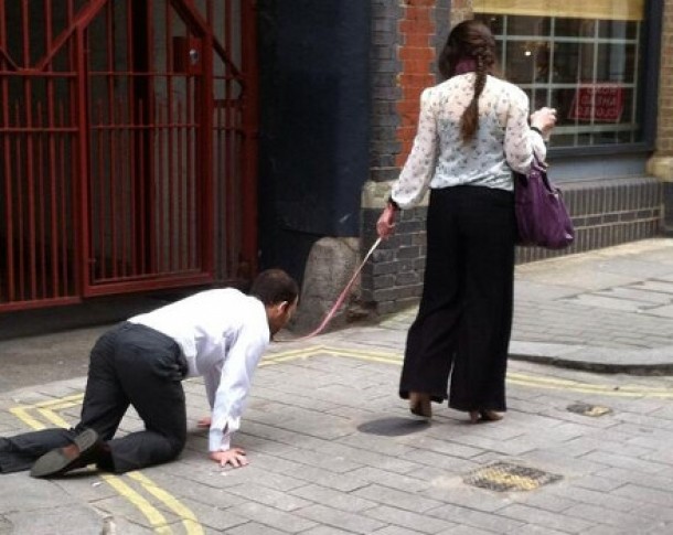 Un barbat care era plimbat exact ca un caine (mergand in patru labe si legat cu o lesa) de catre o femeie a facut deliciul privitorilor pe strazile din Londra. Jurnalistii presupun ca aceasta scena a fost o forma de pedeapsa aleasa de femeie.