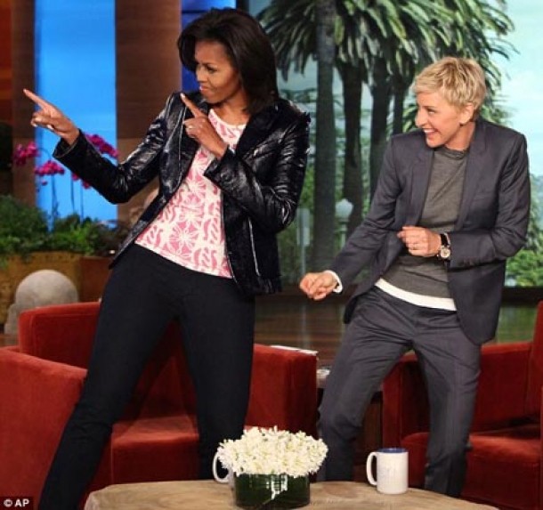 In momentul in care pria doamna a inceput sa o tachineze pe Ellen pentru faptul ca aceasta nu crede ca este in stare sa faca niciuna, Ellen s-a ridicat in picioare, si-a dat jacheta jos si s-au mutat pe podea pentru a incepe. Odata ce au inceput, publicul scanda numarul flotarilor. Michelle Obama a facut 25 de flotari inainte sa fie oprita de gazda emisiunii.