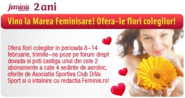 Vino la Marea Feminisare! Asteptam pozele tale pe forum accesand http://www.feminis.ro/forum/dragoste-si-sex/cuplu/concurs-vino-la-marea-feminisare-ofera-le-flori-colegilor-56397/#last si poti fi chiar tu castigatoarea!