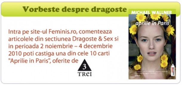 Intra pe site-ul Feminis.ro, comenteaza articolele din sectiunea Dragoste & Sex si in perioada 2 noiembrie – 4 decembrie 2010 poti castiga una din cele 10 carti "Aprilie in Paris", oferite de Editura Trei!