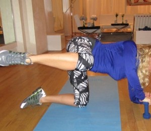 Pentru acest exercitiu vei avea nevoie de o gantera pe care o vei folosi mai mult pentru sprijin. Asaza-te in genunchi si sprijina-te cu mainile de gantera plasata pe sol. Ridica genunchiul drept si deschide-l spre exterior. Intinde apoi piciorul drept in spate, indreptand totodata coloana si capul. Fa cate 10 repetitii pentru fiecare picior.