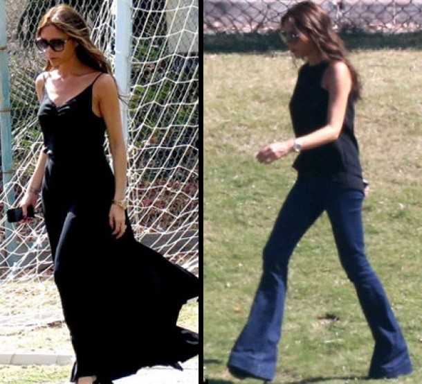 A doua zi, Victoria beckham si-a facut aparitia pe terenul d efotbal intr-o tinuta casual compusa dintr-un top negru si o pereche de jeansi evazati, care alungesc piciorul. Si de data aceasta a purtat o pereche de sandale cu talpa inalta.