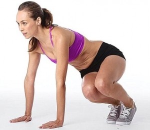 Tine mainile pe sol cu degetele departate si sari cu ambele picioare inspre mana dreapta, aterizand cu picioarele astfel incat genunchii sa ajunga la nivelul cotului drept. Aceasta miscare iti lucreaza intens muschii abdominali.