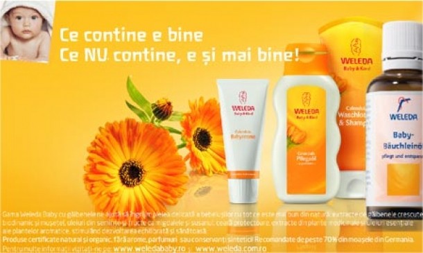 Gama Weleda Baby cu galbenele (Calendula) este conceputa special pentru pielea sensibila a bebelusilor. Toate produsele Weleda Baby contin uleiuri vegetale pure si extracte naturale de galbenele, musetel, migdale sau susan, din culturi controlate biologic si biodinamic, nu contin materii prime pe baza de uleiuri minerale si nici parfumuri sintetice, coloranti si conservanti, care ar putea afecta in vreun fel functiile naturale ale pielii. De asemenea, formula usoara a gamei a fost dovedita de medicii dermatologi, ca fiind foarte bine tolerata chiar si de pielea cu tendinte de neurodermita.