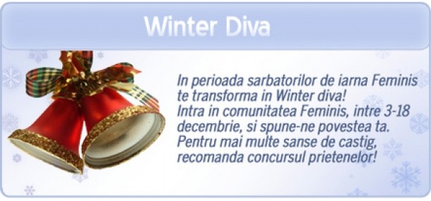 Cadoul special al Feminis de sarbatori este acela de a te ajuta sa te simti o... Winter diva! Scrie-ne pe forum despre tine, spune-ne ce ai lasat pana acum in urma ta, de ce anume iti este greu sa te desprinzi si cum iti doresti sa privesti spre anul ce vine si poti castiga o zi in lumina reflectoarelor: povestea ta va fi publicata pe Feminis.ro, alaturi de celelalte povesti ale femeilor de succes despre care ai citit pana acum pe site: Nadia Comaneci, Mariana Bitang, sotiile diplomatilor romani si multe altele.