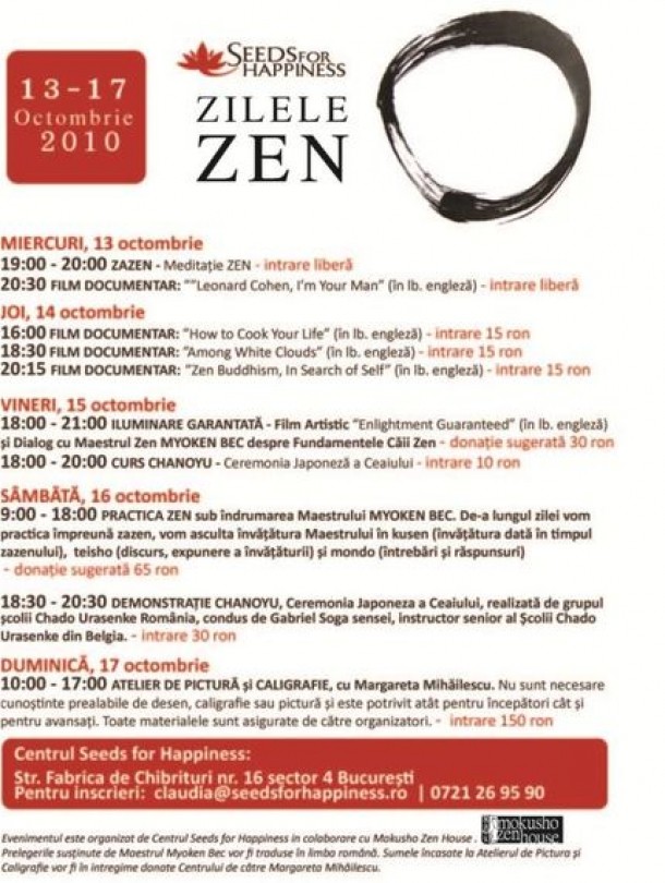 9:00 - 18:00 PRACTICA ZEN sub indrumarea Maestrului MYOKEN BEC. De-a lungul zilei vom practica împreuna zazen, vom asculta învatatura Maestrului in kusen (invatatura data in timpul azenului), teisho (discurs, expunere a invataturii) si mondo (intrebari si raspunsuri) - donatie sugerata 65 ron